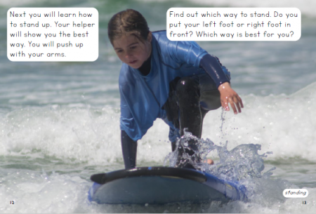 Are you a good swimmer? You could go to a sandy beach to learn to surf. The waves get bigger and then they break and turn white. A helper can show you how to pick a wave that is coming straight in. You will learn how to ride towards the beach. Next you will learn how to stand up on your surfboard and balance as you ride. You will have lots of practice and fun!
